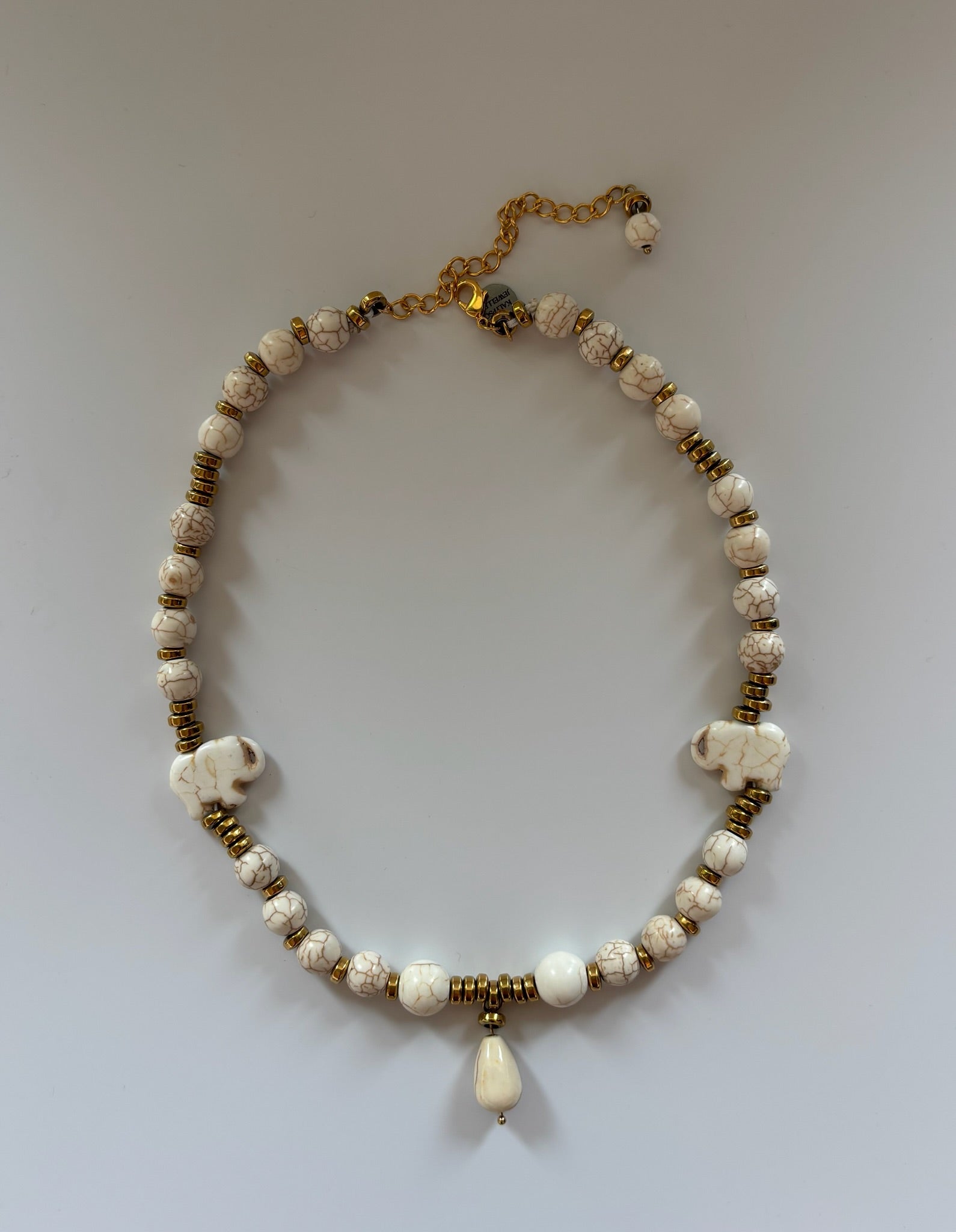 Elevate your style with our collection of howlite and 24k gold plated stainless steel necklaces, featuring unique howlite elephant detailing available in three stunning options. Each necklace features polished howlite stones, renowned for their calming white and grey marbled patterns, beautifully set against the warm glow of 24k gold plated stainless steel.