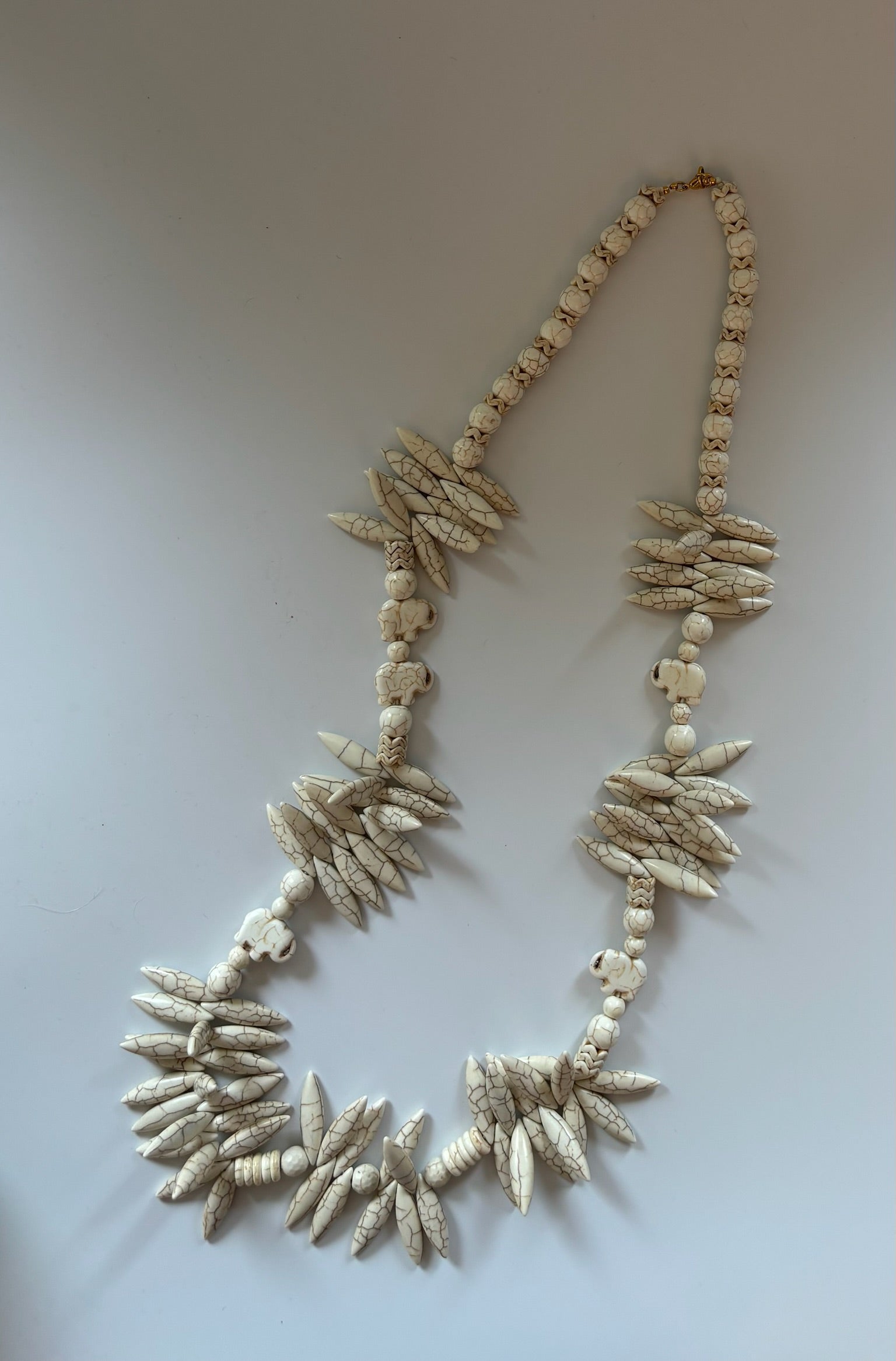 The collection includes a short, delicate necklace that offers a sleek, modern look with smooth howlite and hematite stones. Complementing this are two longer necklaces for a statement piece that adds a touch of sophistication. Both long necklaces showcase howlite stones with charming elephant accents featuring different unique stone designs. Each necklace offers its own unique charm, perfect for layering or wearing solo, making these necklaces a timeless addition to any jewelry collection. Crafted 100% by hand.