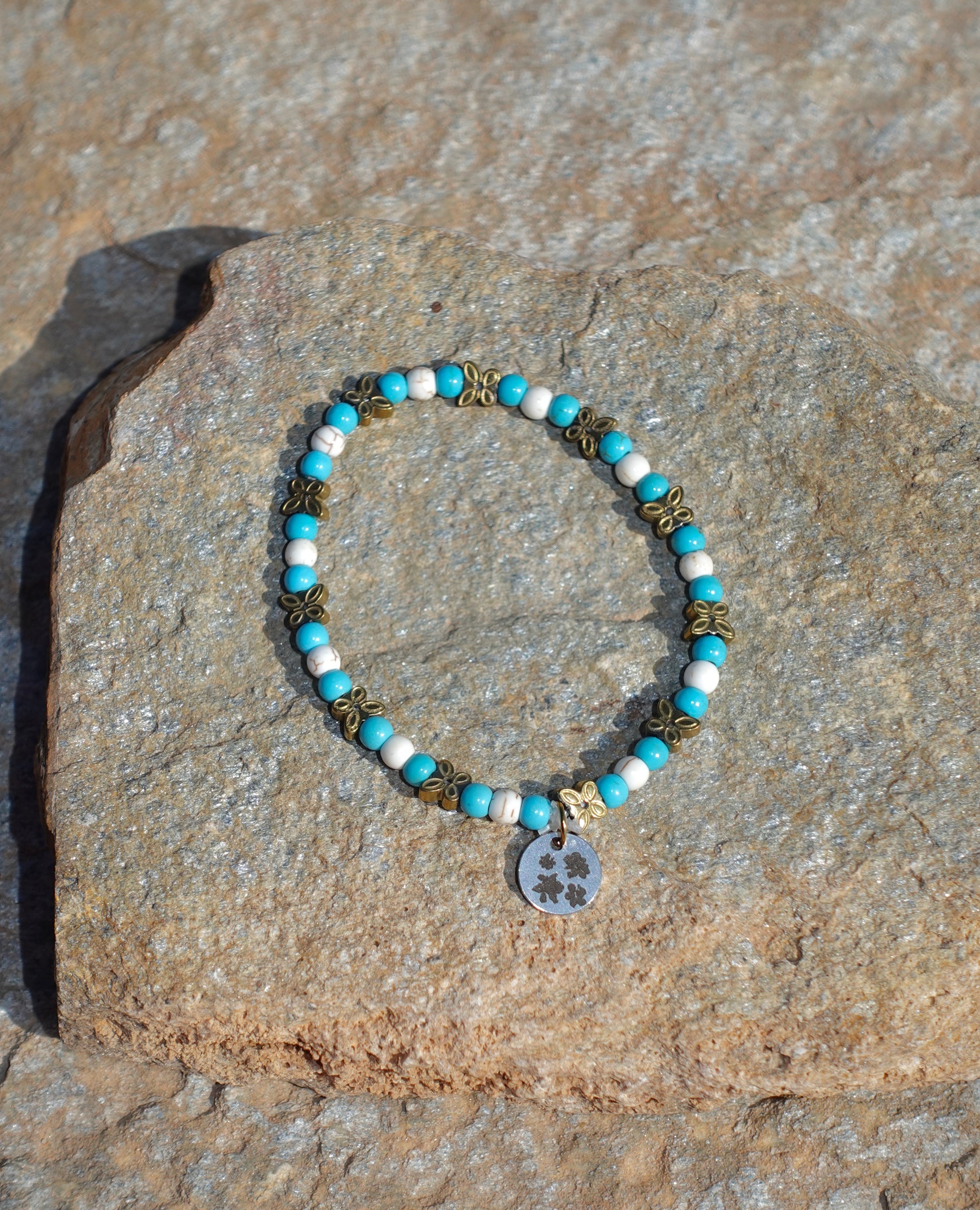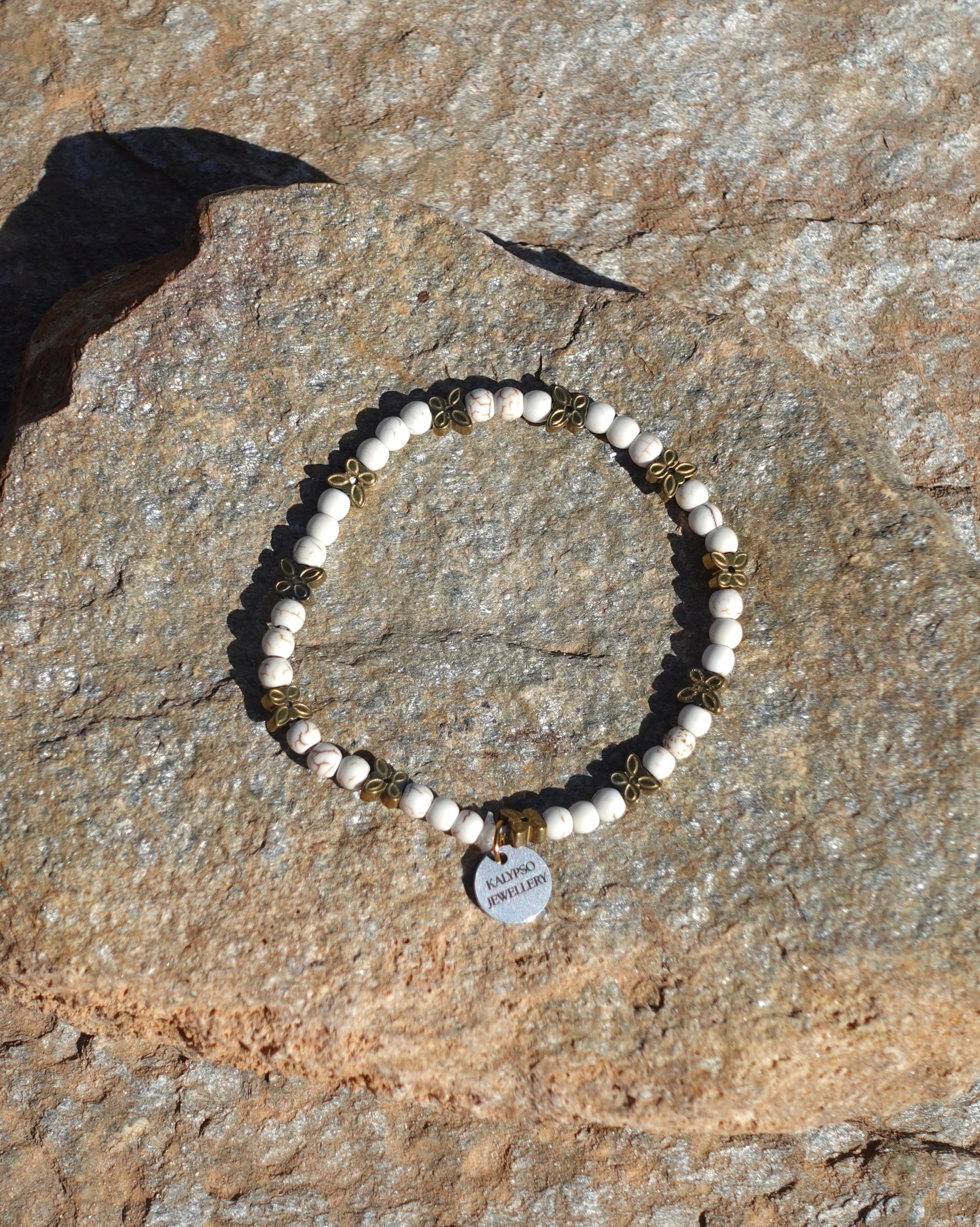 Delicate and quietly detailed, this bracelet features smooth howlite beads accented with gold hematite butterflies for a soft, sculptural touch. Minimal yet expressive, it’s an easy piece to wear alone or layer, a subtle nod to transformation and movement, grounded in natural stone. Crafted 100% by hand.